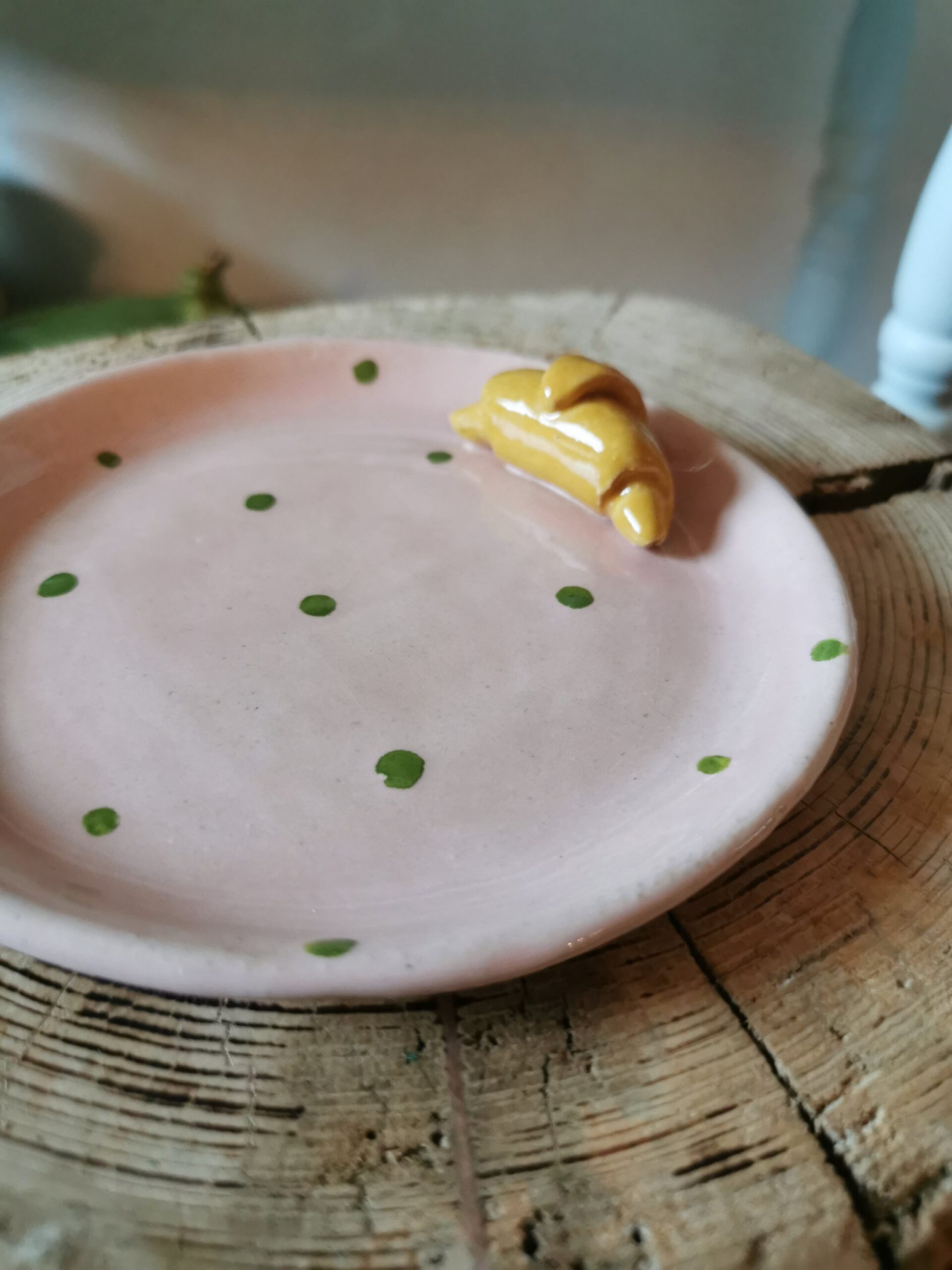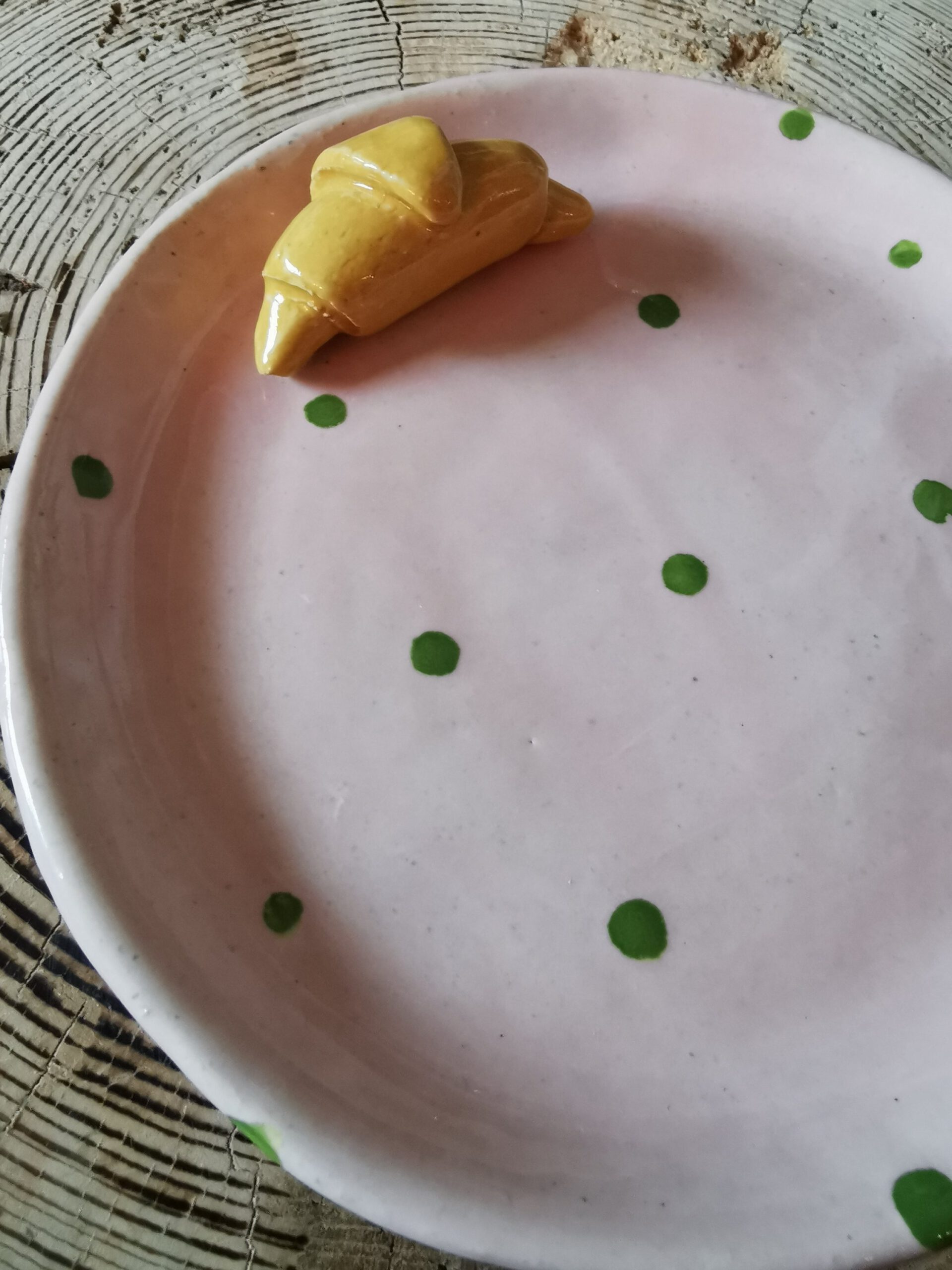 Rosa Croussant Tellerchen mit grünen Punktenund einem Durchmesser von ca. 13 cm.